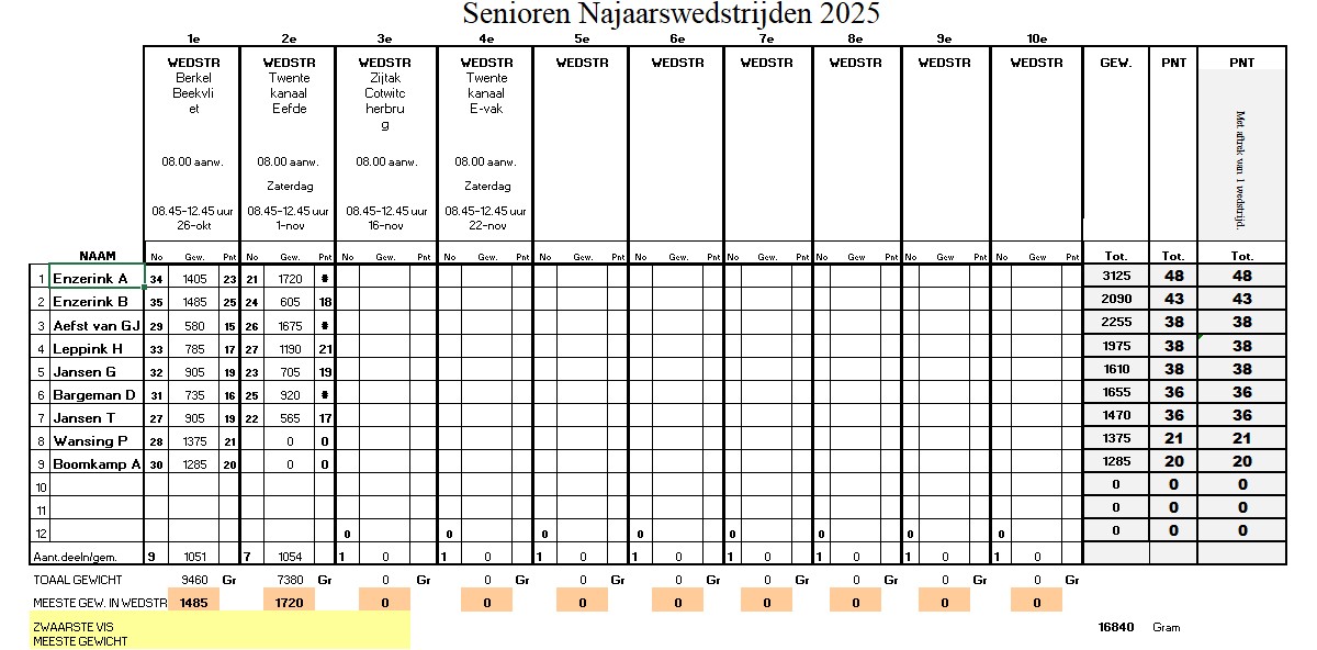 Deze wedstrijd hebben wij gevist in het Twentekanaal E-vak. Bij Eefde wind op de kop en na 9 uur regen verwacht. Er waren 7 vissers die in totaal 7.380 kilo vis vingen. De vissers die hadden gekozen voor de feeder vingen de meeste vis. Volgende wedstrijd 16 november ’25 zijtak Twentekanaal.