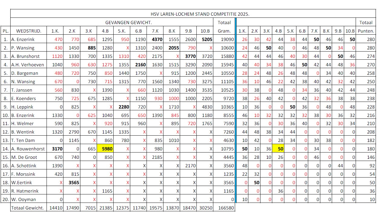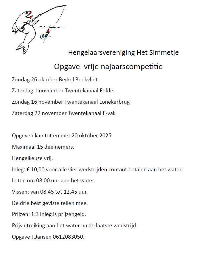 Het Simmetje te Diepenheim viste dit jaar voor het eerst mee in de competitie van Hengelsportvereniging Laren-Lochem. Er werden 10 wedstrijden gevist. Zes wedstrijden in het Twentekanaal en 4 wedstrijden in de Berkel. De beste wedstrijd was in de Berkel bij de Cloese te Lochem. Daar werd door iedereen goed wat vis gevangen, maar over al de wedstrijden gezien waren de vangsten toch wel redelijk. In totaal werd er 166 kilo en 580 gram vis gevangen deze gezamenlijke competitie. Na 10 wedstrijden vissen werd uiteindelijk André Enzerink uit Lochem de nieuwe viskampioen 2025. Het was een geslaagde competitie en de kampioen werd afgelopen zondag bij Bousema te Lochem gehuldigd onder het genot van een hapje en een drankje.