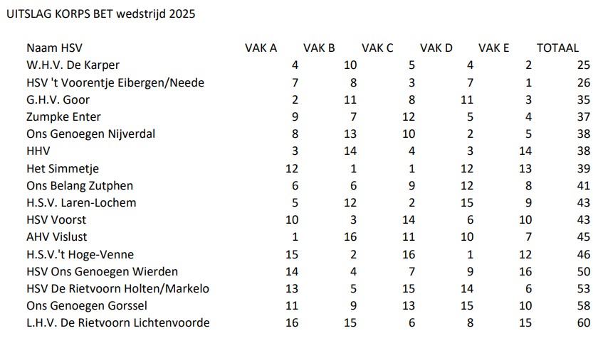 UITSLAG INDIVUEEL BET wedstrijd 2025