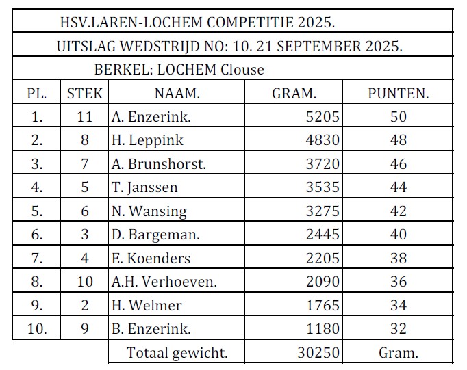 Zondag 21 september is de tiende en tevens laatste competitiewedstrijd gevist samen met Laren\Lochem.